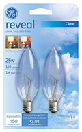 GE 25BC/RVL Reveal, 25W B-10 Shape, Blunt Tip Candelabra Base, Clear Chandelier Lamp, 1,500 Hours, Special Neodymium Glass Filters Out Yellow Light Spectrum Of Ordinary Incandescent Lamps, Providing Color Enhanced Full Spectrum Light Source Which Delivers Pure, Clean, True Light.