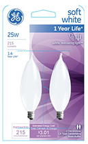 GE, 25CAC/F/CD2-MPD, 2 Pack, 25W, Frosted, Bent Tip, Light Bulb, Multi-Purpose Decorative, Candelabra Base, Maximum Overall Length 4-1/8", 210 Lumens, 1,500 Hours, Carded.
