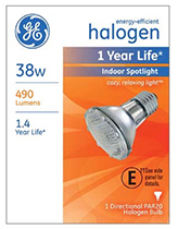 GE, 38PAR20H/SP10, 38W, 120V, Par 20, Halogen Spot Bulb, For Indoor Use, Accent Light Bulb, Energy Saving, Maximum Overall Length 3-1/8", Medium Base, 490 Lumens, 1,500 Hours.